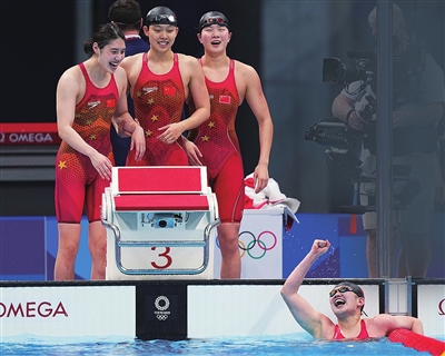 上图:7月29日,中国队选手杨浚瑄(左一)、汤慕涵(左二)、张雨霏(左三)和李冰洁庆祝夺冠。
