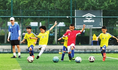 8月3日,汾河体育健身长廊,暑假里的小学生尽情地在绿茵场上角逐。 贾 鹏 米国伟 摄