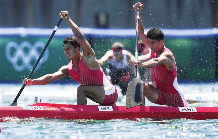 8月3日,中国选手刘浩(左)/郑鹏飞在比赛中。当日,在东京奥运会皮划艇静水男子1000米双人划艇决赛中,中国选手刘浩/郑鹏飞获得亚军。