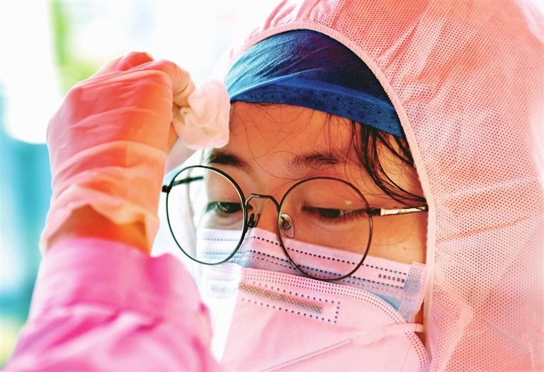 “关键时刻,我们要顶上!”苏晓瑞说。3个小时的工作后,他脱下防护服,全身已经湿透。擦了擦脸上的汗水,又迅速投入下一轮防疫工作中。