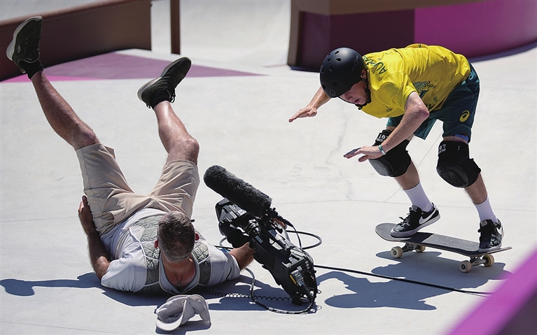 8月5日,澳大利亚选手帕尔默(右)在男子滑板公园赛预赛中撞倒一名摄像师。