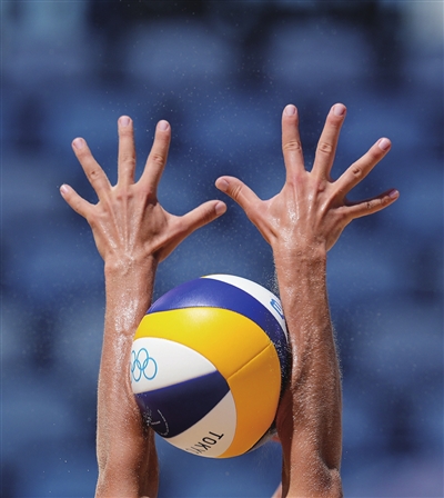 8月5日,澳大利亚队选手克兰西在女子沙滩排球半决赛中拦网。