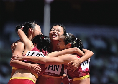 8月5日,中国队庆祝胜利。 当日,东京奥运会田径女子4×100米接力预赛在新国立竞技场举行。 新华社记者 贾宇辰 摄