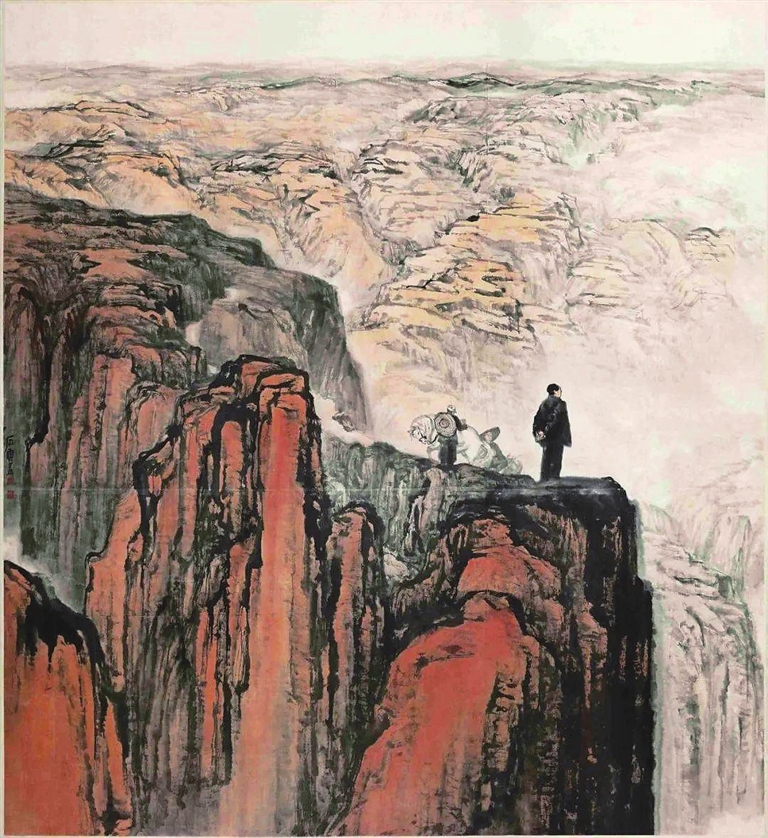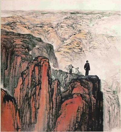 此外,在这幅画中,“人物”与“山水”之间的结构关系也作了与众不同的处理方式。中国山水画讲究“天人合一”,强调人与自然的和谐关系。自宋以后,人物在山水画中是补衬、点缀的存在。而在这幅作品中,石鲁先生则反其道而行之,将人物作为重点,山体成为人物的衬托,突出了毛泽东运筹于沟壑之中,决胜于千里之外的伟人风采。