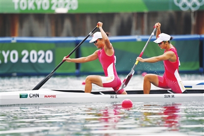 8月7日,徐诗晓(右)/孙梦雅在比赛中。 当日,在东京奥运会皮划艇静水女子500米双人划艇决赛中,中国选手徐诗晓/孙梦雅夺得冠军。 新华社记者 张笑宇 摄