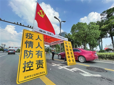 在扬州市主城区主干道上一处疫情防控检查点,交警检查过往车辆人员的“苏康码”等信息(8月6日摄)。 江苏省扬州市近期发生的疫情引发关注,确诊病例快速攀升,中高风险地区不断增加。 截至8月8日0时,扬州市累计报告本土确诊病例308例。目前扬州市共有高风险地区1个,中风险地区75个。 新华社记者 李 博 摄