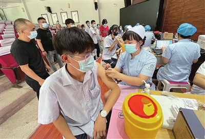 8月9日,太原市第二实验中学内,15岁至17岁学生在知情、同意、自愿的前提下有序接种疫苗。青少年学生安全有效接种新冠疫苗,既是构建校园防控网络的需要,也是构建全民免疫保障的重要组成部分。 邓寅明 摄