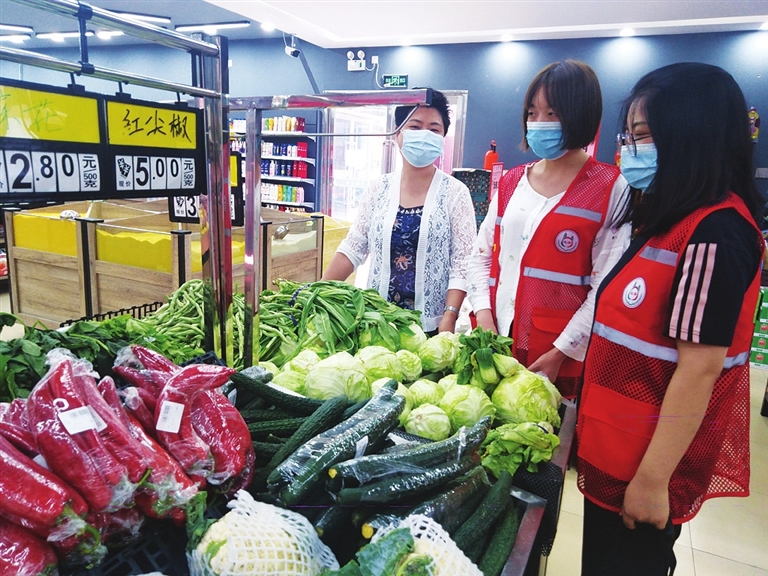 8月10日上午,在社区综合市场内,街面商家走访队的范晓宇正在排查可能存在的风险点。“咱们售卖的是入口的食物,一定要做好防疫措施,记得勤洗手,顾客买东西的时候也提醒他们尽量用夹子!”范晓宇认真地叮嘱市场里的摊主。