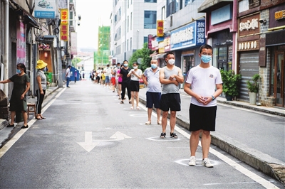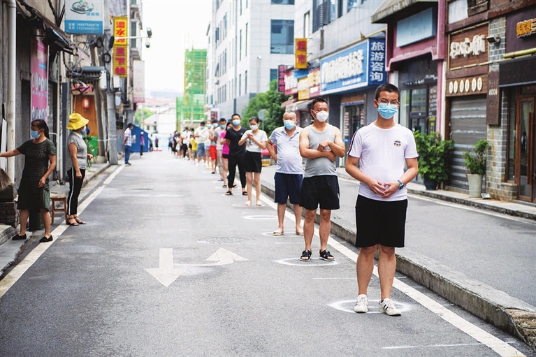 8月10日,在张家界市永定区官黎坪街道,居民排队等待做核酸检测。当日,根据疫情形势和防控工作需要,湖南省张家界市启动第六轮全民核酸检测工作。自7月29日张家界市发现首例新冠肺炎确诊病例以来,截至8月9日24时,张家界市累计报告新冠肺炎确诊病例53例,无症状感染者3例。目前张家界市共有高风险地区3个,中风险地区11个。 新华社记者 陈思汗 摄