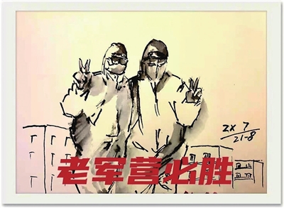 老张便想到,画幅漫画帮助家人和朋友放松心情。他拿起钢笔,寥寥数笔,十几分钟便画出两位防疫人员的形象。他们穿着防护服,虽然面罩遮住了面部,但从他们比出的“胜利”手势看,信心跃然纸上。画完后,张老又用电脑在画作上加了五个红色字体“老军营必胜”。