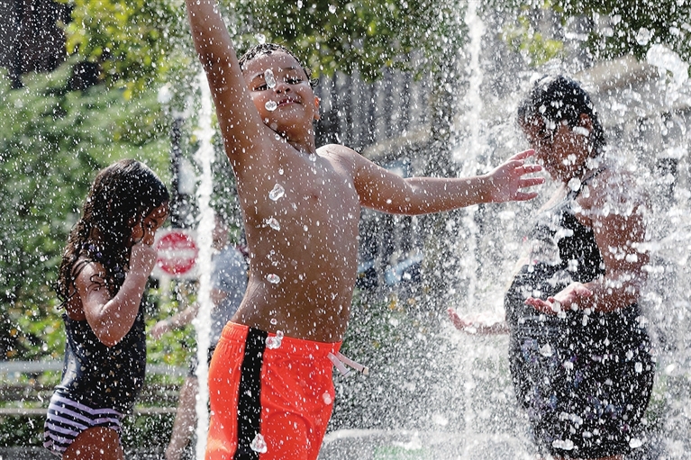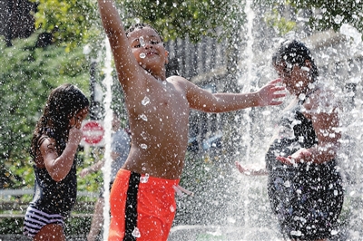 8月12日,人们在美国波士顿的一个喷泉里戏水消夏。 美国多地近日遭遇高温天气。 新华社/美联