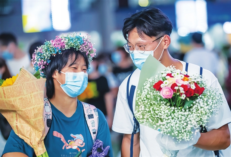 八月十二日,在昆明斗南花卉交易市场,游客手持选购的鲜花。新华社记者 陈欣波 摄