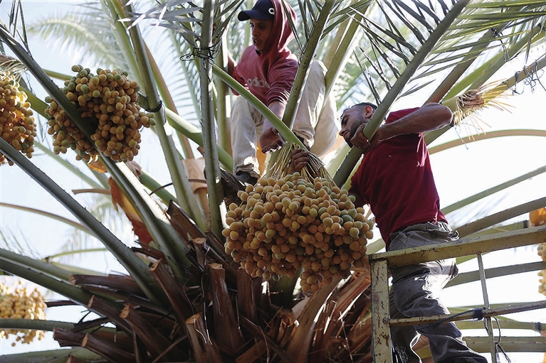8月15日,农民在约旦河西岸村庄耶夫泰利克采摘椰枣。椰枣是西亚和北非沙漠绿洲常见绿色乔木枣椰树的果实,营养丰富,亦被称为沙漠面包。 新华社/欧新