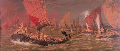 猎猎红旗在画面中是一个视觉线索,它是胜利的象征。这些红旗与千百艘船的船帆,营造出一种排山倒海的气势,体现出胜利之势不可阻挡。