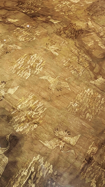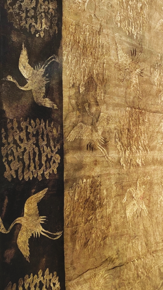 石头、青铜可以千年不朽,而这件丝织品鹤氅保存得如何呢?其实,它在墓里沉睡了近千年,出土时有一些破损。2019年,大同市博物馆与中国丝绸博物馆合作,对鹤氅进行了保护修复。修复过程历时6个月,经过科学分析、消毒、去污、平整、背衬织物染色、缝合等保护手段,这件精美绝伦的丝织品才完美地呈现在世人面前,让我们有机会目睹千年丝织物的肌理,聆听历史文物所承载的神秘又日常、古老又鲜活的故事,追溯凝聚在经纬交错间的民族工艺。