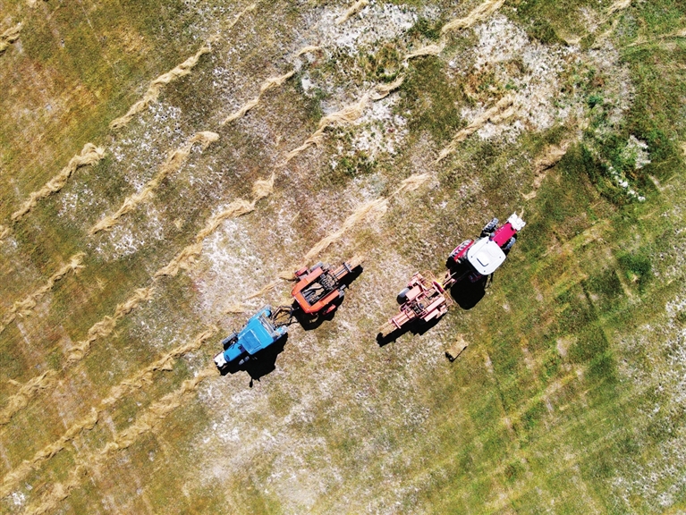 8月20日,在新疆巴里坤草原,牧民驾驶捆草机将牧草打包成捆(无人机照片)。 秋意渐浓,天山南北牧区已进入天然草场打草季,在天山东段北部的新疆巴里坤大草原上,牧民们忙着收割牧草,为牲畜赶制越冬口粮。 新华社记者 高 晗 摄