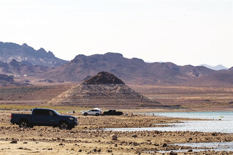 这是8月20日在美国内华达州博尔德附近拍摄的米德湖岸边干涸的土地。受美国西部地区干旱天气影响,科罗拉多河进入缺水状态,位于内华达州和亚利桑那州之间的美国最大水库米德湖水位降至历史低点。新华社/欧新