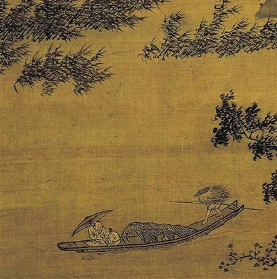 明·戴进《风雨归舟图》(局部) 一叶扁舟逆风前行,船夫的蓑衣被风吹得飞起;水中的芦苇和岸上的树叶摆动角度很大,说明雨很大。