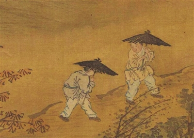 明·谢时臣《风雨归邨图》(局部) 大风劲吹,雨说下就下。行人费力地撑着伞冒雨前行,走两步,退三步,形象地描绘出风大雨疾。