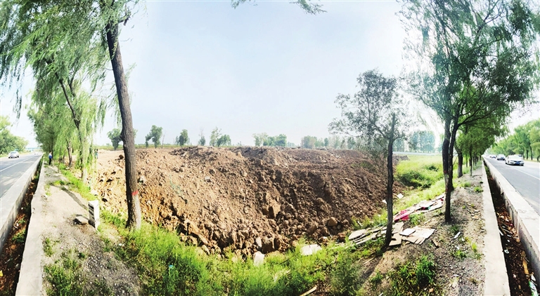 在西谷乡339国道旁,因渣土以及混凝土类建筑垃圾乱倾乱倒,形成数个足球场大的建筑垃圾场,厚度近2米。大量黄土裸露着,没有任何苫盖。