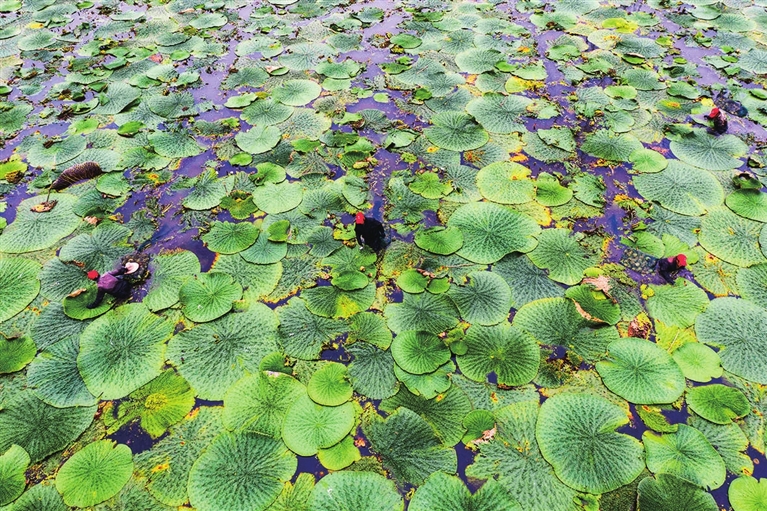8月28日,江苏省泰州市姜堰区顾高镇申俞村的农民在采收芡实(无人机照片)。 近日,江苏多地种植的芡实进入采收季,种植芡实的水塘里随处可见丰收的繁忙景象。 新华社发 (汤德宏 摄)