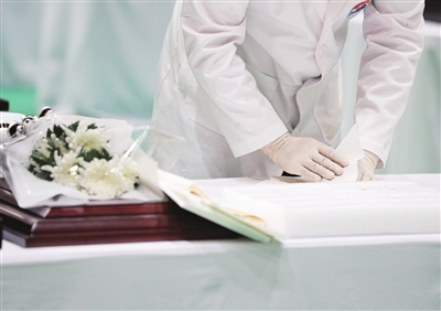 下左图:9月1日,在韩国仁川,韩方工作人员将志愿军烈士遗骸入殓。