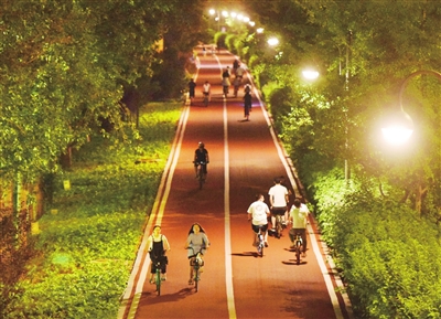 9月4日晚,汾河景区自行车专用道上,不少市民在骑行中欣赏美景。在这个秋高气爽的季节,约上两三个好友,沿着自行车道体验骑行的快乐,已成为不少市民的新选择。 邓寅明 摄