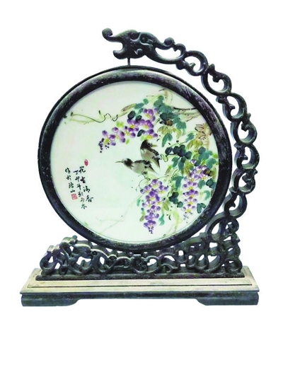 这件插屏,高30厘米,宽约25厘米。座框由鸡翅木透雕而成龙首祥云缠枝纹,龙首古朴威武,祥云缠枝简约灵动。龙颈之下是圆形的粉彩瓷板画屏芯,直径约20厘米。瓷板画当中一树稠密的春花,紫色的花瓣、金色的花蕊,在春日的天空下娇艳绽放。两只黄莺鸟立于枝头花上,一只尖嘴朝上,似乎在婉转歌唱;另一只回首凝望,仿佛也被这美丽的春花所吸引。瓷板画的左下角题有“花有清香”,源自苏东坡的《春宵》“花有清香月有阴”。落款为“丁卯年刘雨岑作于珠山”。