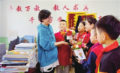9月9日,双塔南巷小学四年二班的同学们将亲手制作的插花作品送给敬爱的老师,在教师节送上最真挚的祝福。 米国伟 摄