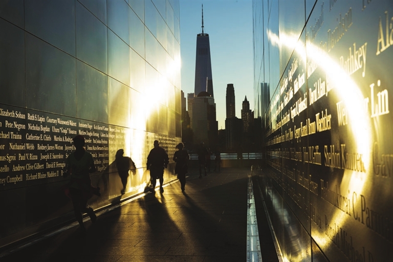 9月11日,在美国新泽西州泽西城的自由州立公园,人们走过“空旷的天空”纪念碑。 当日,美国多地纪念“9·11”恐怖袭击事件二十周年。2001年9月11日,恐怖分子劫持美国4架民航客机,两架撞毁纽约世贸中心双子塔,一架撞毁五角大楼一角,另一架坠毁,事件共造成2977名无辜者死亡。新华社记者 王 迎 摄