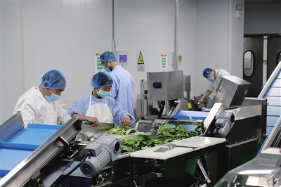 每天清早6时,来自山西恒茂现代农业示范园区的各类蔬果,还挂着露珠,经过并州饭店质检员现场验视后,它们“坐上”保鲜运输车,来到太原并州饭店智慧央厨配送基地,留样送检合格后入库,等待进入蔬菜加工车间“洗刷刷”。