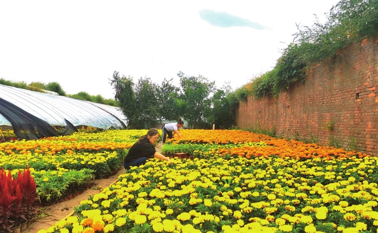 在村东头,上千间花卉温室大棚整齐排列,串串红、万寿菊、矮牵牛等十余种草花开得正艳,红的、黄的、紫的甚是好看,似在迎接丰收节的到来。