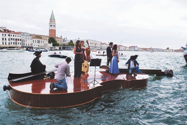 9月18日,在意大利威尼斯,音乐家站在一条小提琴形状的船上演奏乐曲。 新华社/路透