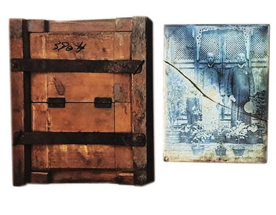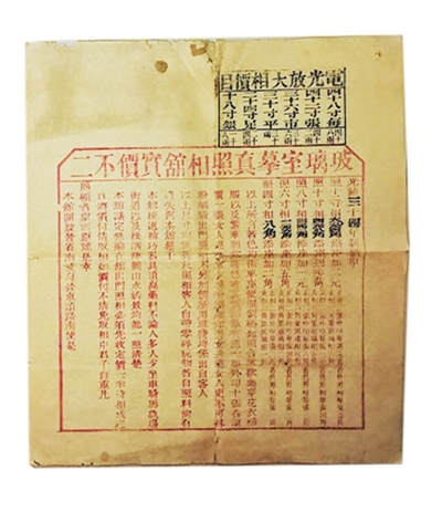 我收藏有这家照相馆的一份玻璃底片和一张价目表。玻璃底片上,是两位着长衫的清代中年男性,至今还很清晰。玻璃底片放在一个合页式木夹中,木夹背面还配有两个金属卡扣,用来保存底片。价目表上印有“玻璃室摹真照相馆实价不二”“光绪三十四年新价目”等字样。