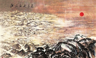 这幅山水巨制由毛泽东主席亲笔题字。画作庄重典雅,笔墨淋漓,气势磅礴,高5.5米、宽9米,画面右上角的一轮红日的直径就将近1米,尺幅之大创下了历史纪录。