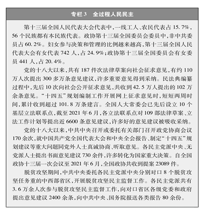 人民享有广泛民主权利。在中国,国家一切权力属于人民。人民依法实行民主选举、民主协商、民主决策、民主管理、民主监督(专栏3)。在中国,年满18周岁、具有中华人民共和国国籍、依法享有政治权利的公民,都有选举权和被选举权。坚持普遍、平等、直接选举和间接选举相结合以及差额选举、无记名投票的原则,依法保障人人享有平等的选举权利。社会主义协商民主广泛多层制度化发展,人民通过各种途径、渠道、方式,就改革发展稳定重大问题,特别是事关人民切身利益的问题广泛协商,找到全社会意愿和要求的最大公约数。党和国家制定实施重大决策,广泛征求和听取各方面意见,最大限度吸纳民意、汇集民智、凝聚民力,努力实现决策科学化民主化。人民广泛、直接参与社会事务管理,实现自我管理、自我服务、自我教育、自我监督。人民依照宪法和法律规定,有权对国家机关和国家工作人员提出批评和建议,有权对国家机关和国家工作人员的违法失职行为提出申诉、控告或者检举。民主选举、民主协商、民主决策、民主管理、民主监督各个环节环环相扣、彼此贯通,实现过程民主和结果民主、形式民主和实质民主、直接民主和间接民主相统一,保障了人民的知情权、参与权、表达权、监督权。