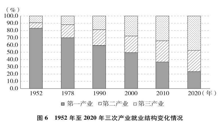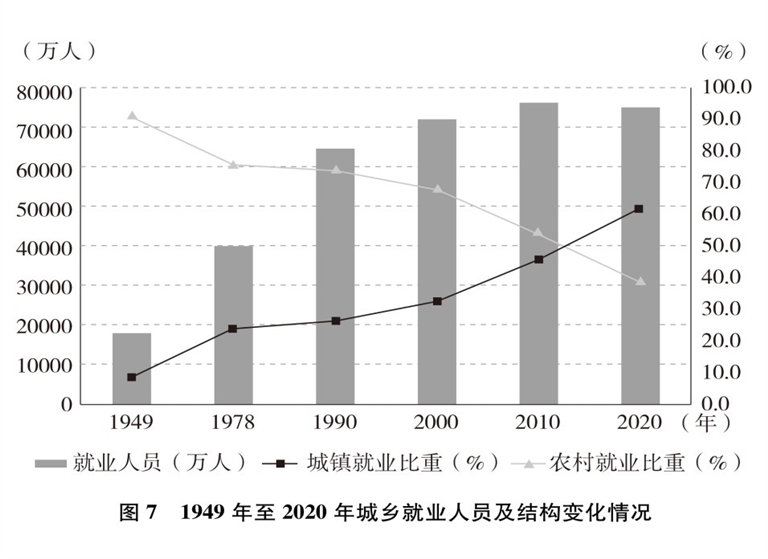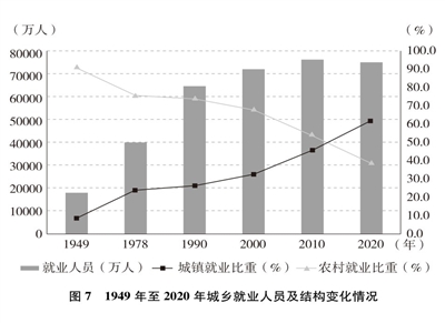 图7 1949年至2020年城乡就业人员及结构变化情况