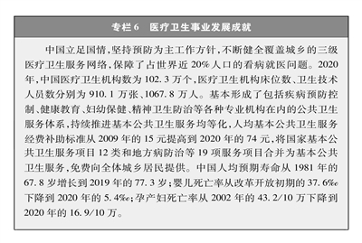 全民健康托起全面小康。新中国成立以来,从疫病横行到可防可控,从缺医少药到病有所医,从只能本地报销到逐步异地结算,从单纯医院就医到家庭医生签约服务覆盖面不断扩大,中国医疗卫生体系逐步健全,医疗资源配置进一步优化,人们看病难、看病贵的问题逐步得到缓解(专栏6)。医疗技术水平和服务能力不断提升,“互联网+医疗健康”持续发展,医药价格逐步回归合理水平,越来越多的常用药、救命药纳入医保目录,人民群众看得上病、看得起病、看得好病。城乡基本医疗公共服务均等化不断推进,农村医疗卫生服务体系持续改善,医疗保障制度不断健全,农村居民看病就医有地方、有医生、有保障,因病致贫、因病返贫问题得到有效解决。健康中国行动加快推进,全民健身和全民健康持续融合,有利于健康的生活方式、生产方式、经济社会发展模式和治理模式正在形成。人民健康水平不断提升,从新中国成立之初处于世界平均水平到现在处于中等收入国家前列。中国取得抗击新冠肺炎疫情重大战略成果,中国医疗卫生体制的优越性进一步彰显,人民生命健康得到有效维护。