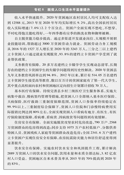 贫困群众与全国人民一道迈进小康。实施精准扶贫方略,做到扶持对象、项目安排、资金使用、措施到户、因村派人、脱贫成效“六个精准”,实施发展生产、易地搬迁、生态补偿、发展教育、社会保障兜底“五个一批”。到2020年底,中国如期完成新时代脱贫攻坚目标任务,现行标准下9899万农村贫困人口全部脱贫,832个贫困县全部摘帽,12.8万个贫困村全部出列。少数民族和民族地区脱贫攻坚成效显著,到2020年底,内蒙古自治区、广西壮族自治区、西藏自治区、宁夏回族自治区、新疆维吾尔自治区和贵州、云南、青海三个多民族省份3121万贫困人口全部脱贫;28个人口较少民族全部实现整族脱贫,一些新中国成立后“一步跨千年”进入社会主义社会的“直过民族”,又实现了从贫穷落后到全面小康的第二次历史性跨越。农村建档立卡贫困人口的收入和福利水平大幅提高,“两不愁三保障”全面实现,教育、医疗、住房、安全饮水等条件明显改善,既满足了基本生存需要,也为后续发展奠定了基础(专栏8)。从2016年起,通过大力实施易地扶贫搬迁,960多万居住在“一方水土难养一方人”地方的建档立卡贫困人口告别穷山恶水之地,易地搬迁,实现了脱贫。脱贫攻坚唤醒了贫困群众对美好生活的追求,提振和重塑了自力更生、自强不息、勤劳致富、勤俭持家、创业干事、创优争先的精气神,增强了脱贫致富的信心和劲头。脱贫攻坚任务目标完成后,对脱贫地区、脱贫人口实施跟踪监测,设立一定过渡期保持帮扶政策总体稳定,定期检查、动态管理,早发现、早干预、早帮扶,提升脱贫地区自主发展能力,激活脱贫人口自我发展动力,确保稳定脱贫、防止返贫。