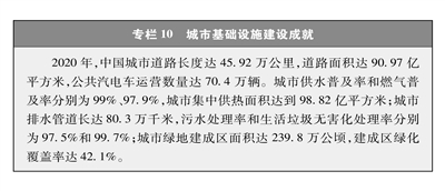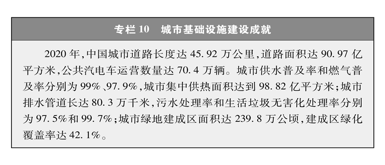 城镇化水平持续提高。城镇化是现代化的必由之路,是实现全面小康的幸福之路。新中国成立前,中国大地上城镇寥若晨星、衰败破落;今天的中国,城镇繁星璀璨、繁华时尚。中国经历了世界近现代史上规模最大、速度最快的城镇化进程,从1949年至2020年,常住人口城镇化率由10.6%提高到63.9%,城市数量由132个增长到687个,建制镇数量由2000个增长到2.1万多个。现代化国际化的大都市、厚重雍容的历史古都、典雅精致的文化名城、类型迥异的特色小镇,星罗棋布,城城不同,风景各异。城镇化的加快推进,形成了面积庞大、人口众多、联系紧密的城市群,成为经济发展和现代化建设的重要载体,提升了城市运行效率和居民生活质量。中国基本形成以城市群为主体、都市圈为依托,大中小城市和小城镇协调发展的城镇体系。