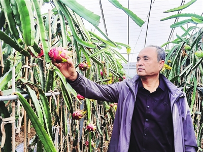 近几年,通过引进樱桃、火龙果、无花果、猕猴桃等品种,中下温村鹏飞生态园的种植规模不断扩大,吸引了大批游客观光体验,逐渐成为市民休闲游玩的好去处。“国庆节期间,生态园主要以火龙果采摘为主,到了10月中下旬,旁边两座大棚栽种的‘波姬红’无花果就成熟了。这一品种的无花果口感清香,甜而不腻,最近有不少游客都在咨询无花果何时可以采摘。”中下温村党支部书记王晓刚向记者介绍,生态园的智能日光温室全部配备了自动温度湿度控制系统、滴灌系统等设施,为这些南方水果创造了温暖舒适的生长环境,市民可以不受季节等因素影响,一年四季有果摘。