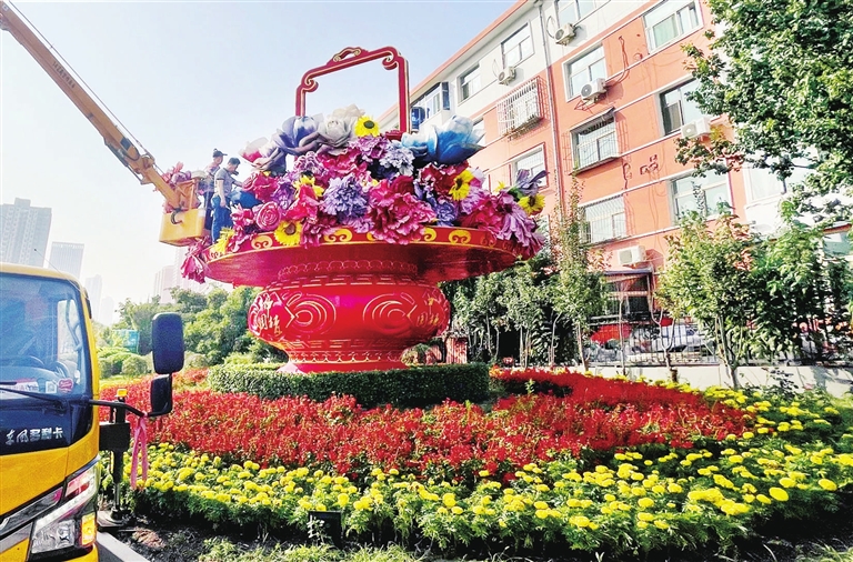 九月二十八日,西矿街上,园林工人正在安装景观“大花篮”。临近国庆节,我市街头巷尾处处洋溢着喜庆氛围。 记者 邓寅明 摄