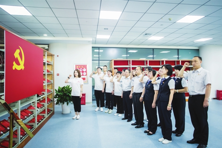 近日,建设银行太原晋阳支行第三党支部、国药控股山西益源连锁有限公司第四党支部一同前往山西省图书馆,开展了“回望百年路、携手新征程”联学共建主题党日活动。双方共学党史、共悟思想,面向党旗集体宣誓,重温入党誓词,汲取奋进力量。
