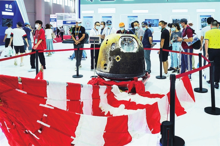 在广东珠海举行的第十三届中国国际航空航天博览会上,国家航天局展区展出嫦娥五号返回舱、降落伞以及由嫦娥五号取回的月球样品实物等,吸引了观众的目光。 新华社发