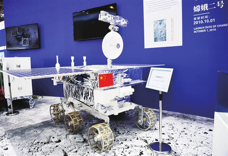 左图:9月29日,观众在航展上观看嫦娥五号返回舱和降落伞。右图:航展上展示的月球车模型(9月29日摄)。