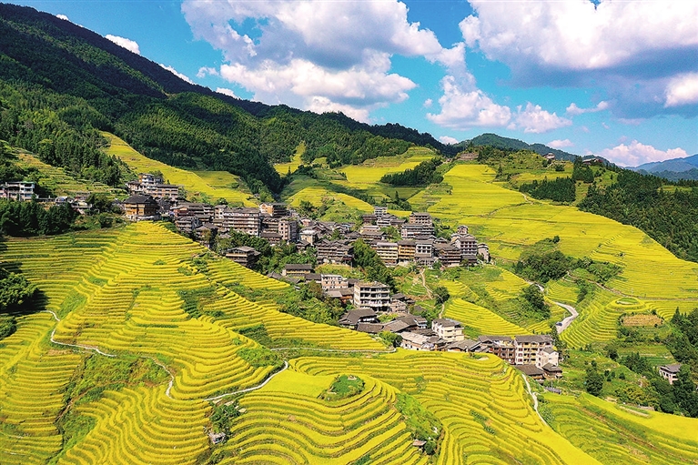 | 这是10月1日拍摄的广西桂林市龙胜各族自治县龙脊梯田秋日景观(无人机照片)。 新华社发 (潘志祥 摄) |