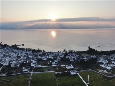 | 这是10月2日在云南大理湾桥镇拍摄的洱海日出景观(无人机照片)。 新华社发 (李云生 摄) |
