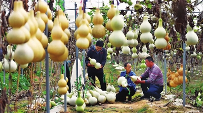 10月7日,阳曲县南路村葫芦种植专业户向顾客介绍葫芦相关知识。近年来,南路村逐步以“一村一品”种植模式调整农业产业结构、培育葫芦种植为特色的主导产业,促进农民增收,为乡村振兴注入活力。