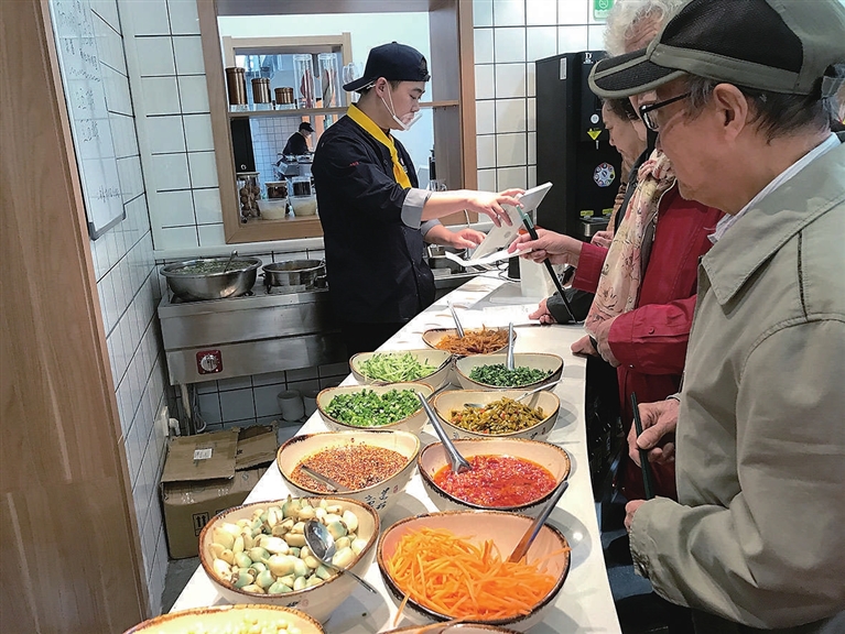 11时30分,食堂开门迎客。73岁的刘小云和80岁的老伴杨宗义点了两碗茄子小炒肉面。“这碗面,足有四两,售价每碗8元,社区老年人享受9折优惠,每碗7.2元。”刘小云高兴地说,“以前常为做饭、吃饭发愁,自从有了社区食堂,我们几乎天天来这儿吃饭,省心、省事,好吃不贵。”