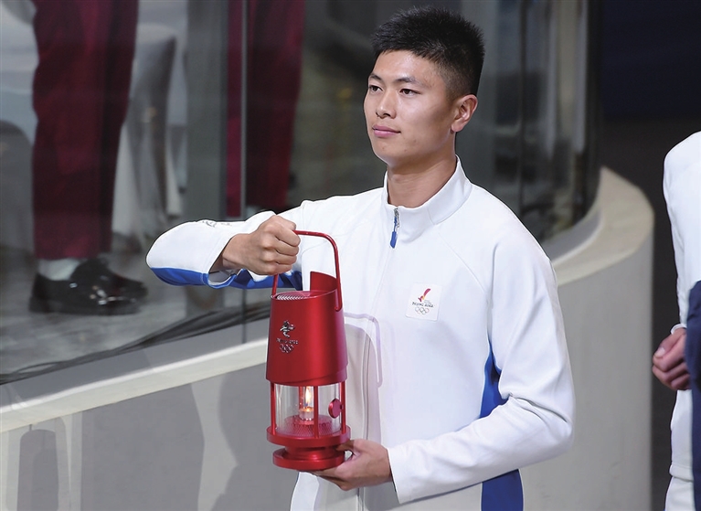 10月20日,在火种欢迎仪式上,护卫人员手持火种灯。